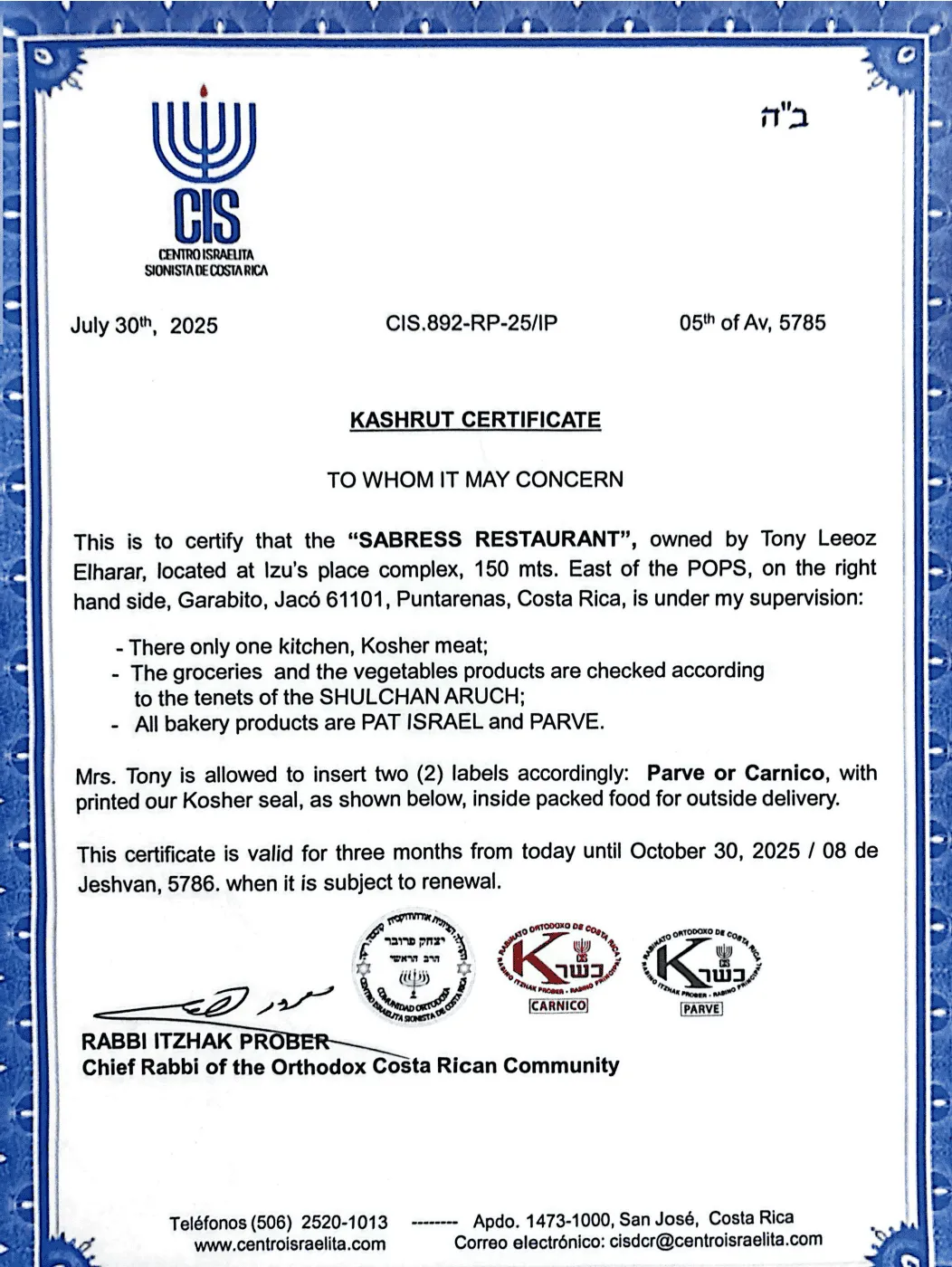 Sabress restaurant also provides kosher catering services. With a special and rich Moroccan/Mediterranean-style menu.